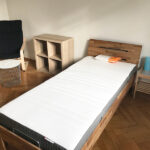 Zimmerausstattung | Lit avec sommier et matelas, chevet, armoire, bureau, chaise et étagère. Parties communes: un hall, une cuisine agencée, salle de bain et WC séparé. |